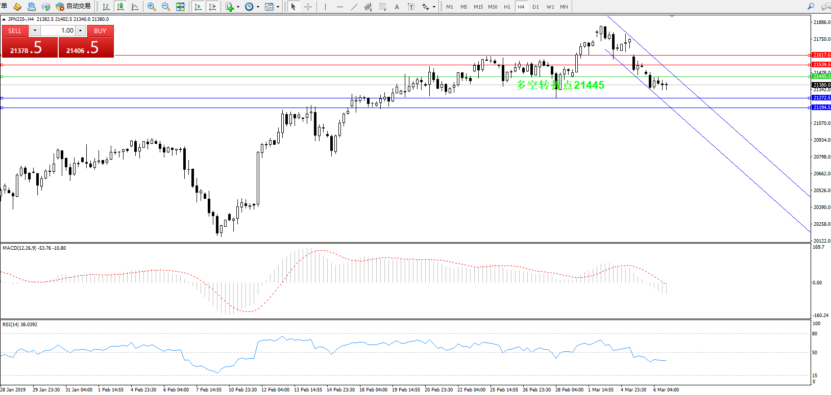 日本股市在星期三走低,其中化工、石油和塑料、造船业和橡胶等下跌的板块带领股指走低。日经指数 .N225 收跌0.6%21,596.81点,支撑位见于25日移动均线切入位21,177点附近。市场依然存在对中美贸易问题的担忧,此前美国务卿蓬佩奥在接受媒体采访时说,如果美中贸易协议不完美,总统特朗普将会予以拒绝,但美国仍将继续努力进行磋商。美国2ADP就业人数增幅不及预期,美国2ADP就业人数增加18.3万,预期增加19万,前值增加21.3万,只要就业人数超过10万,在当前周期下就是十分健康的水平。
