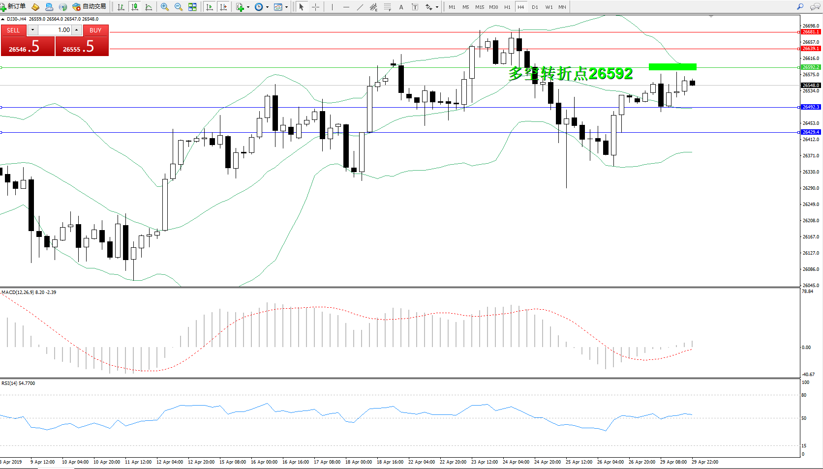 道琼斯指数DJ30—— 4小时K线图显示:
