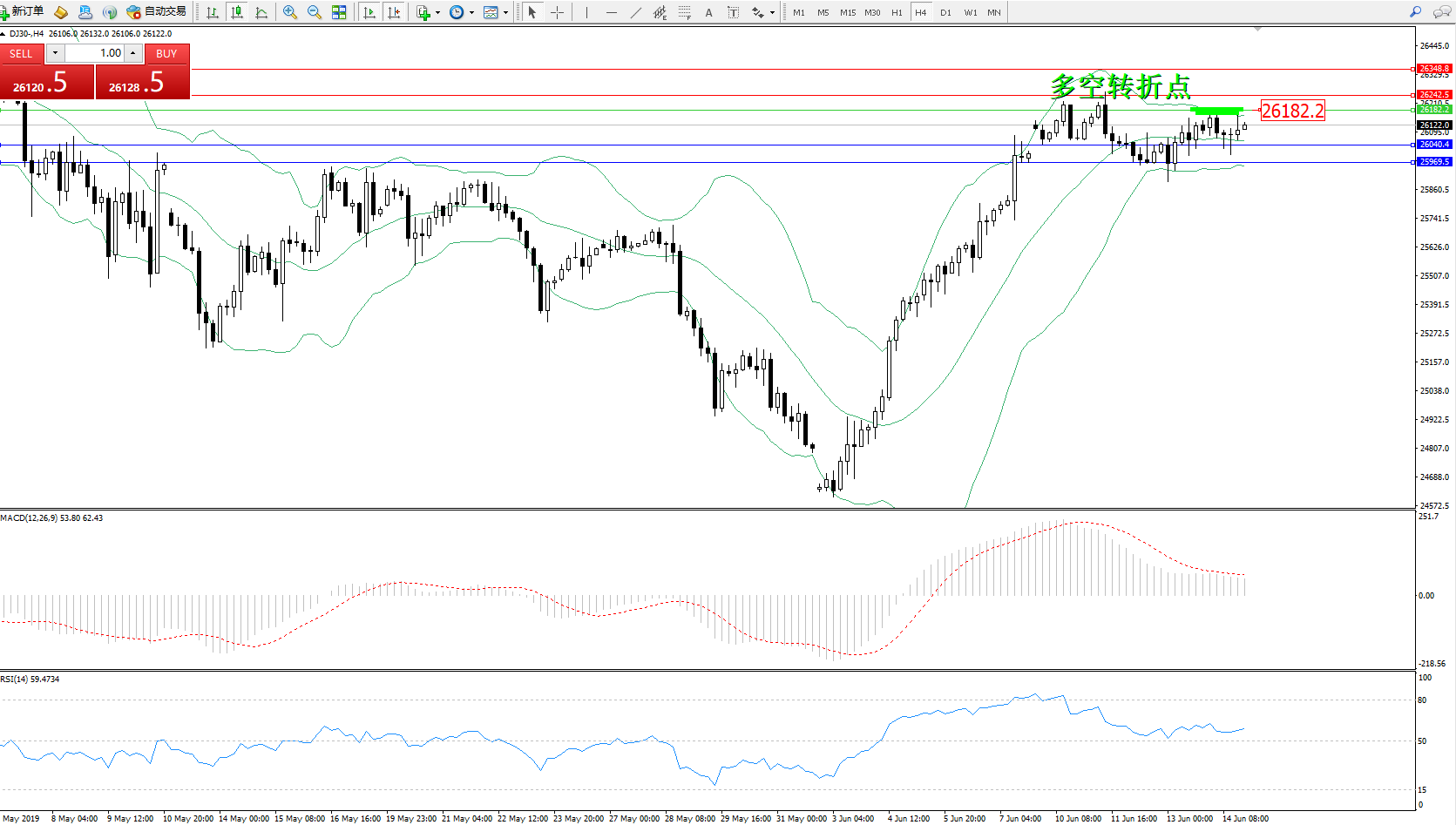 道琼斯指数DJ30—— 4小时K线图显示: