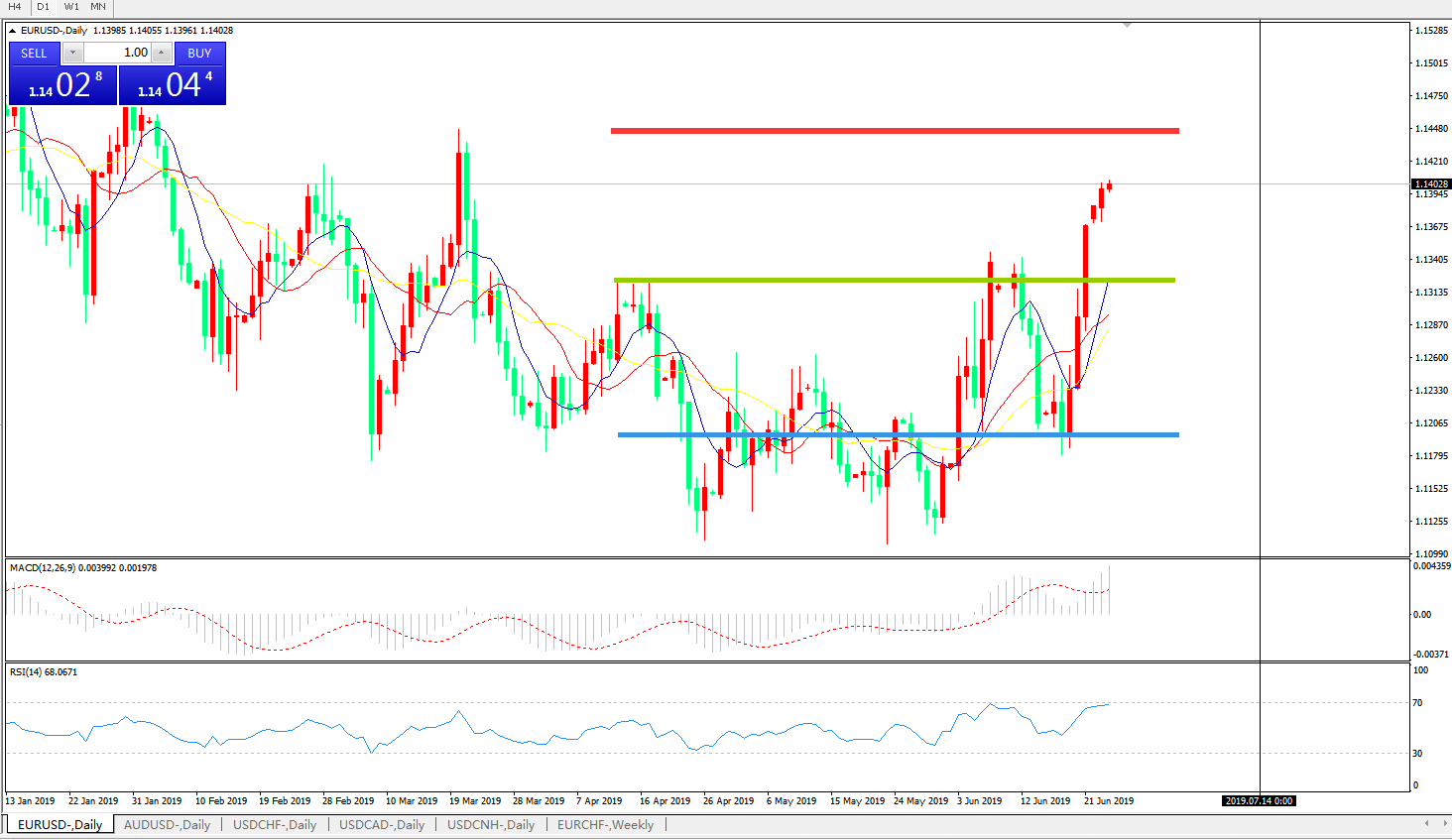 技术面简析:日图均线呈有序多头排列,汇价继续强势上攻MACD在0轴上方运行且持续放量,RSI逼近超卖区域,预计汇价将进一步上行。