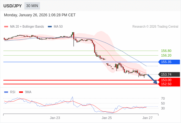 在 155.35 之下,看跌,目标价位为 153.00 ,然后为 152.50 。