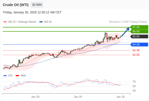 在 64.30 之上,看涨,目标价位为 66.50 ,然后为 67.20 。