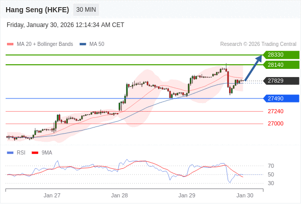 在 27490 之上,看涨,目标价位为 28140 ,然后为 28330 。