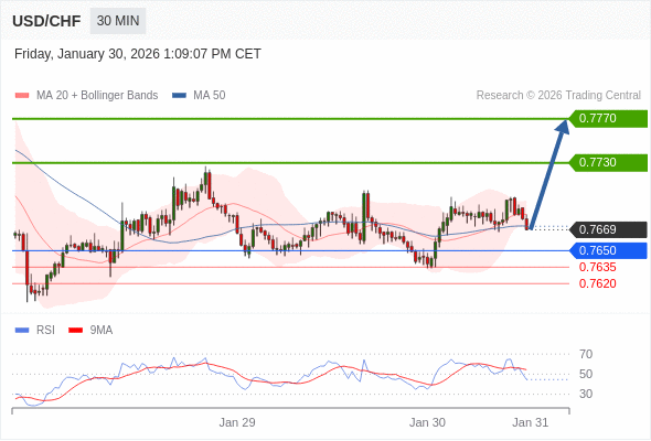 在 0.7650 之上,看涨,目标价位为 0.7730 ,然后为 0.7770 。