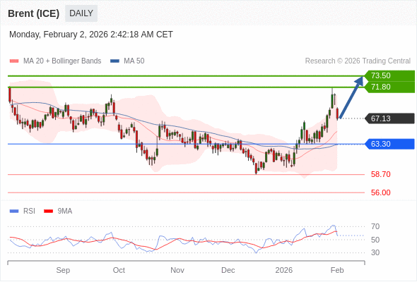 在 63.30 之上,看涨,目标价位为 71.80 ,然后为 73.50 。
