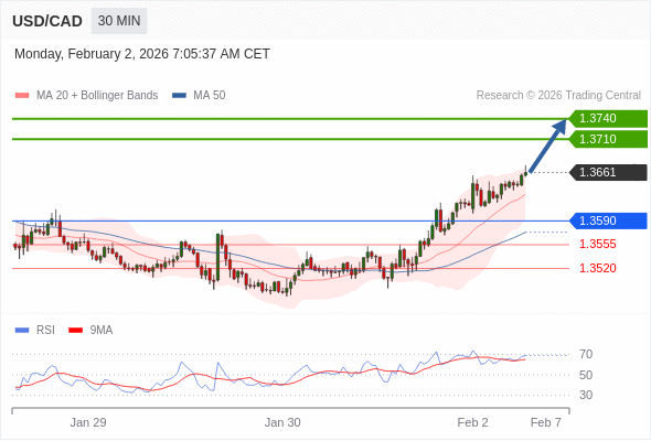 在 1.3590 之上,看涨,目标价位为 1.3710 ,然后为 1.3740 。