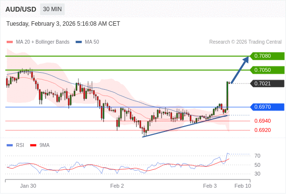 在 0.6970 之上,看涨,目标价位为 0.7050 ,然后为 0.7080 。
