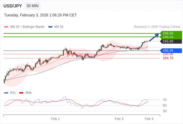 在 155.25 之上,看涨,目标价位为 156.25 ,然后为 156.50 。