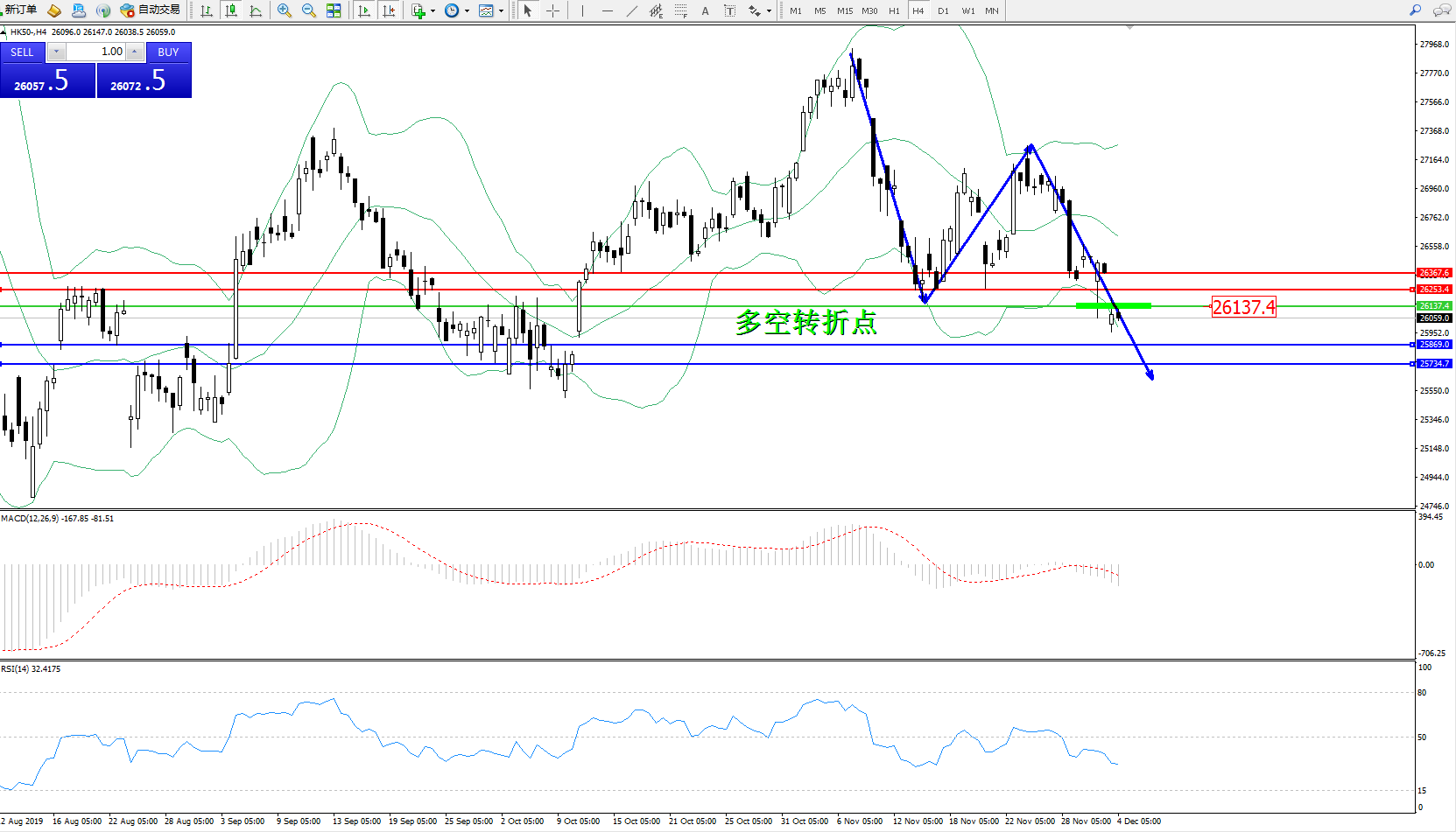 香港恒生指数124日(周三)收盘下跌328.74点,跌幅1.25%,报26062.56点;受累美股急挫,昨晚夜期率先跟跌,再破26000关口,低见25949,最多跌432点,收市前重上26059收。恒指早上亦跟随大幅低开,再跌穿26000关口,低见25995。美国总统特朗普最新言论令投资者担忧贸易局势可能继续恶化,且市场恐慌程度的CBOE波动率指数(VIX)大涨,市场担忧情绪升温,近日恒指稍呈弱势,持续在26000附近横新,更受外围消息主导,投资者也不敢过份进取。