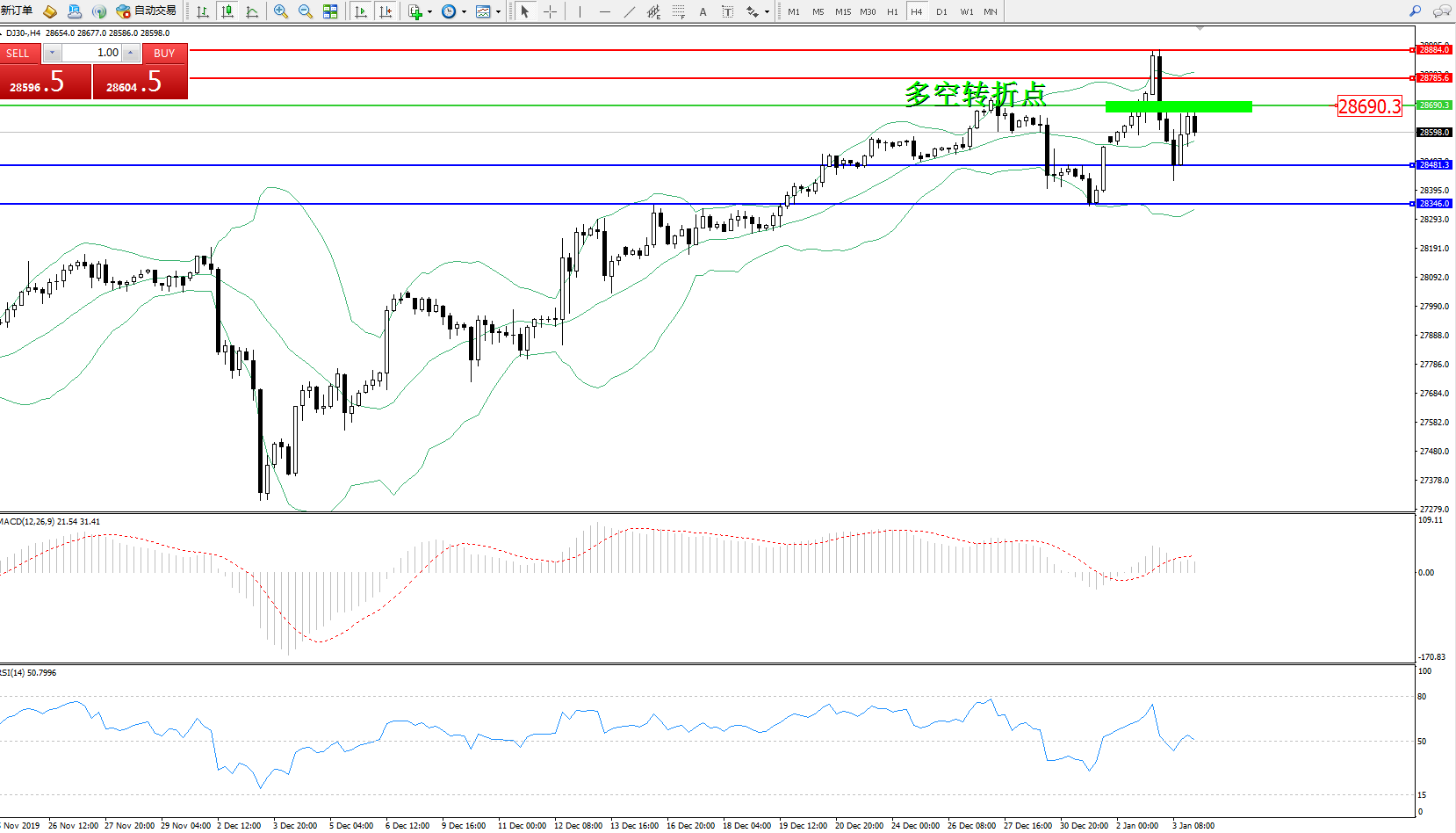 道琼斯指数DJ30—— 4小时K线图显示: