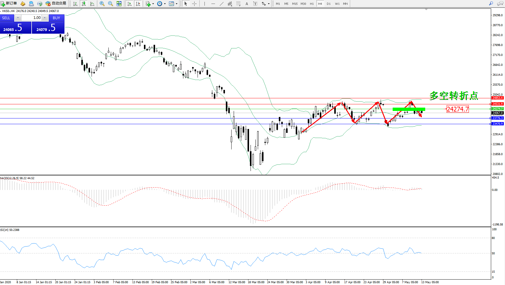 恒指HK50 ——4小时K线图显示: