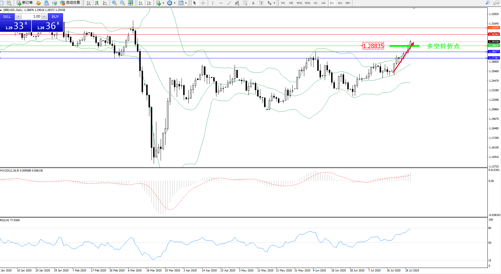 交易策略:1.28835上方看涨,目标1.30264、1.31076
