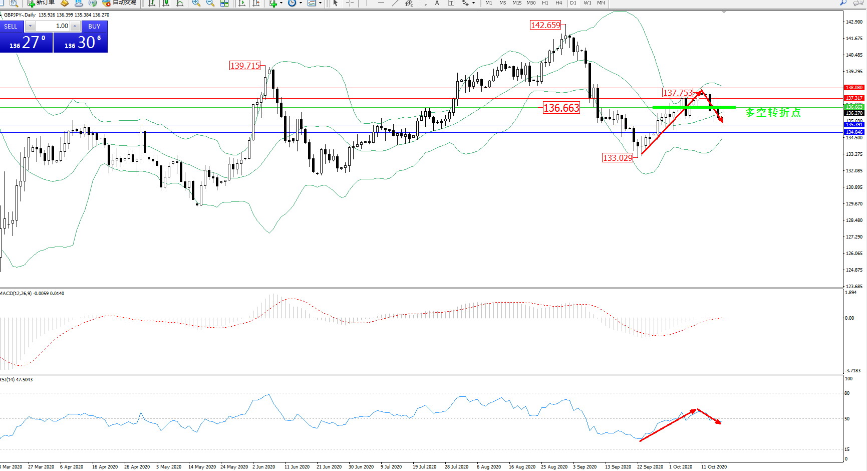 交易策略:136.663下方看跌,目标135.391、134.846