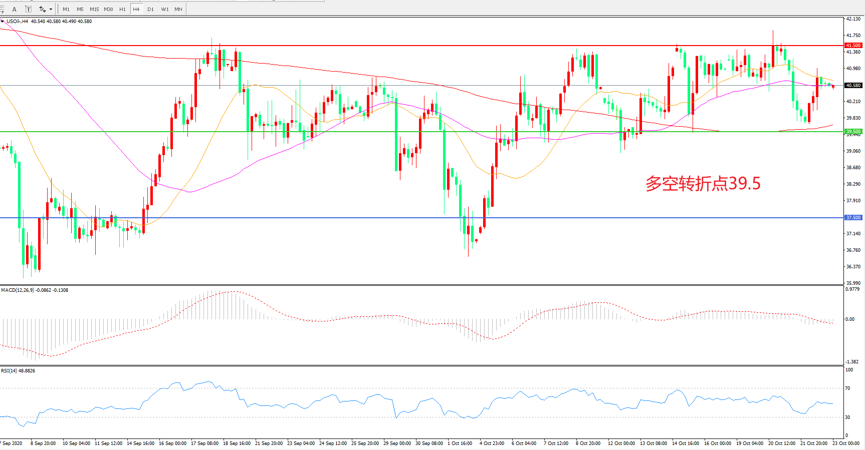 4小时图看,油价回踩39.5美元附近小幅反弹,箱体震荡形态明显,200周期均线成为下方支撑,41.5成为上方阻力,MACD红柱增加,RSI指标走平,日内延续震荡概率较大。