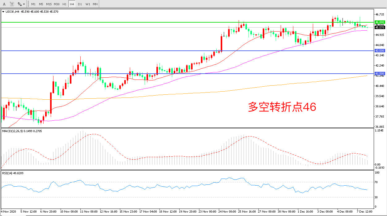 4小时图看,油价延续高位震荡,46美元成为多空分水岭,55周期均线成为短期支撑,MACD红柱减少,RSI指标走平,日内延续震荡概率较大。