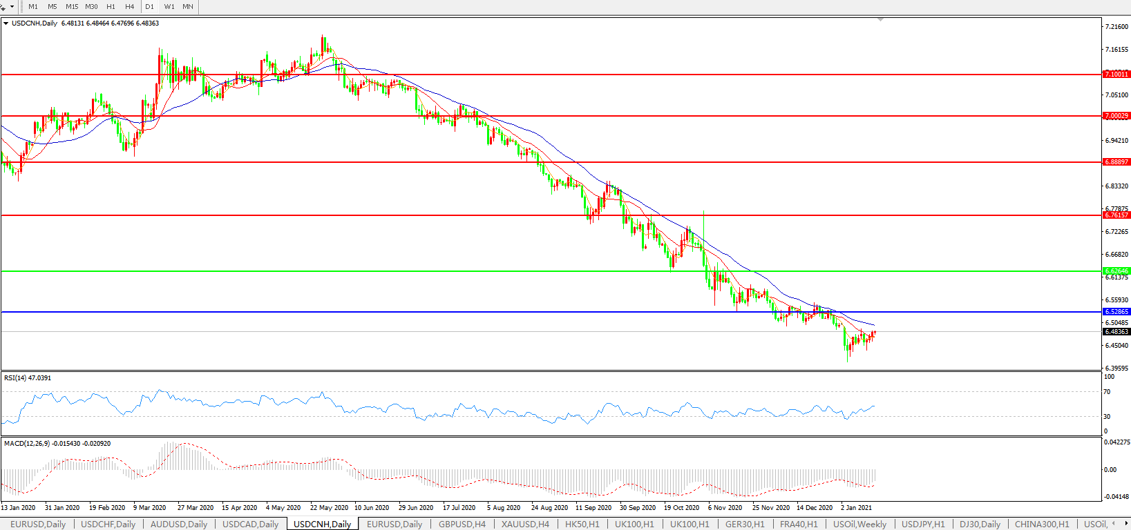 备选策略: 在6.6265之上,看涨,目标价位为6.7615,然后为6.8889。