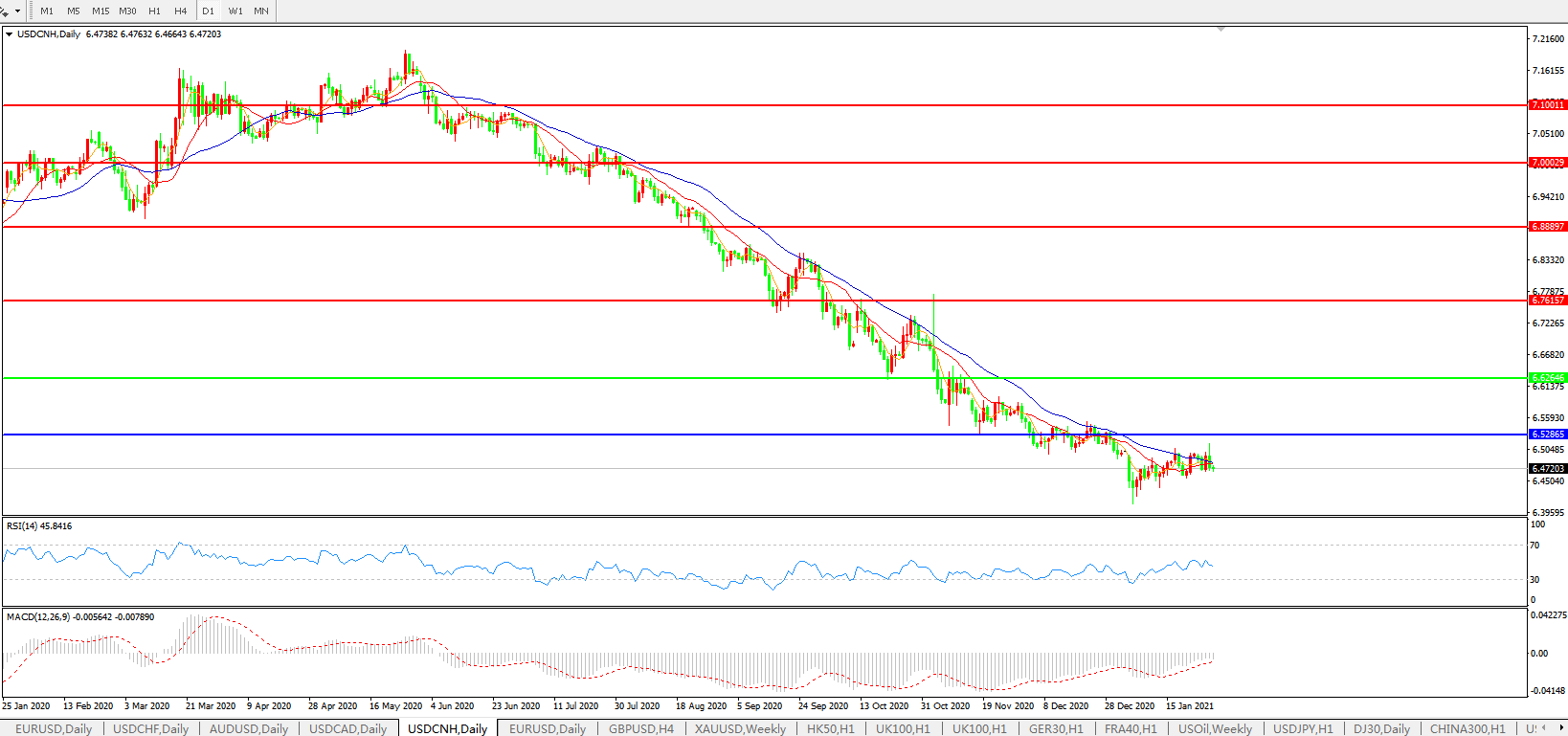 美元兑人民币USDCNH 日线图: