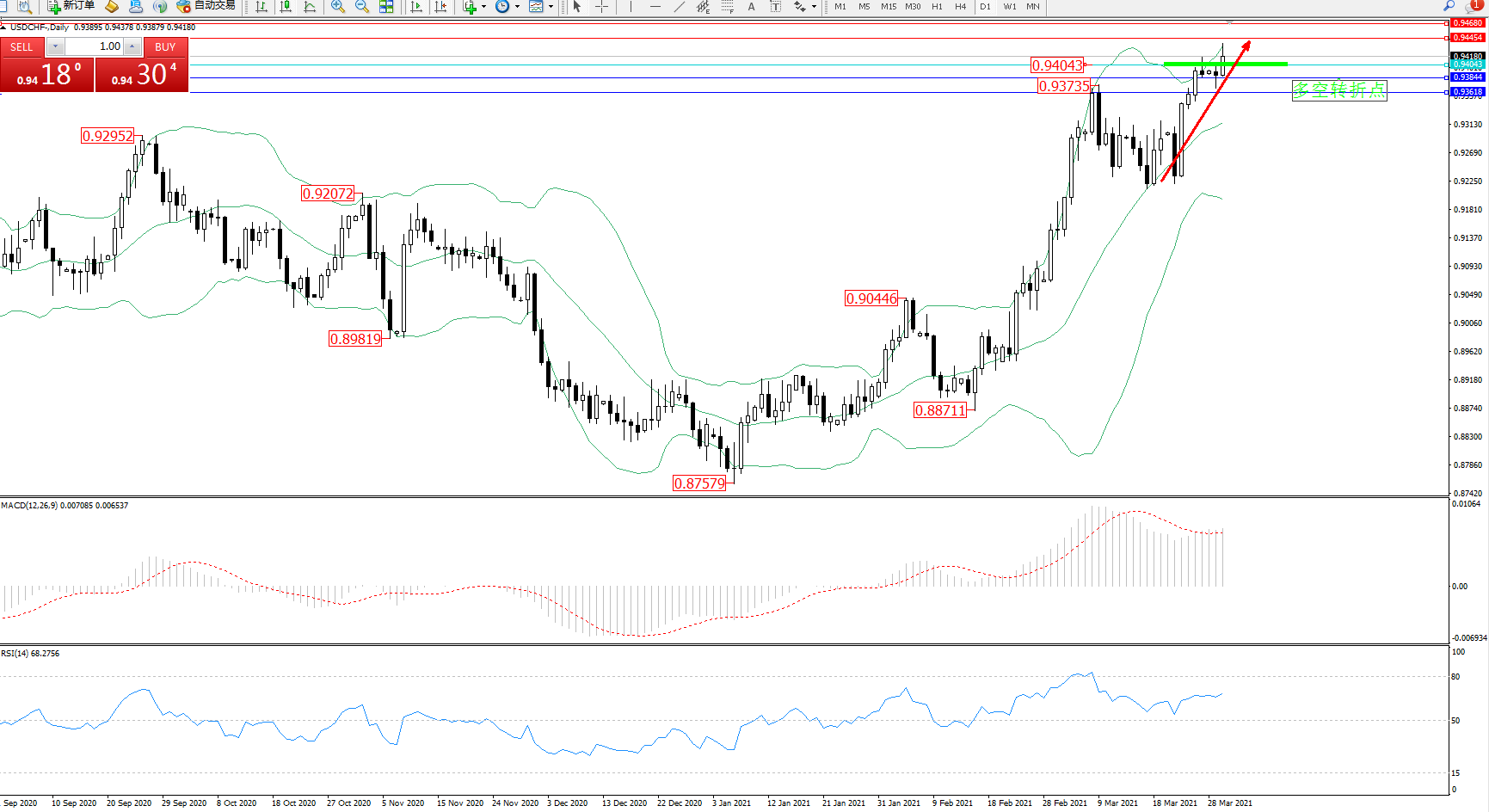 交易策略:0.94043上方看涨,目标0.94454、0.94680