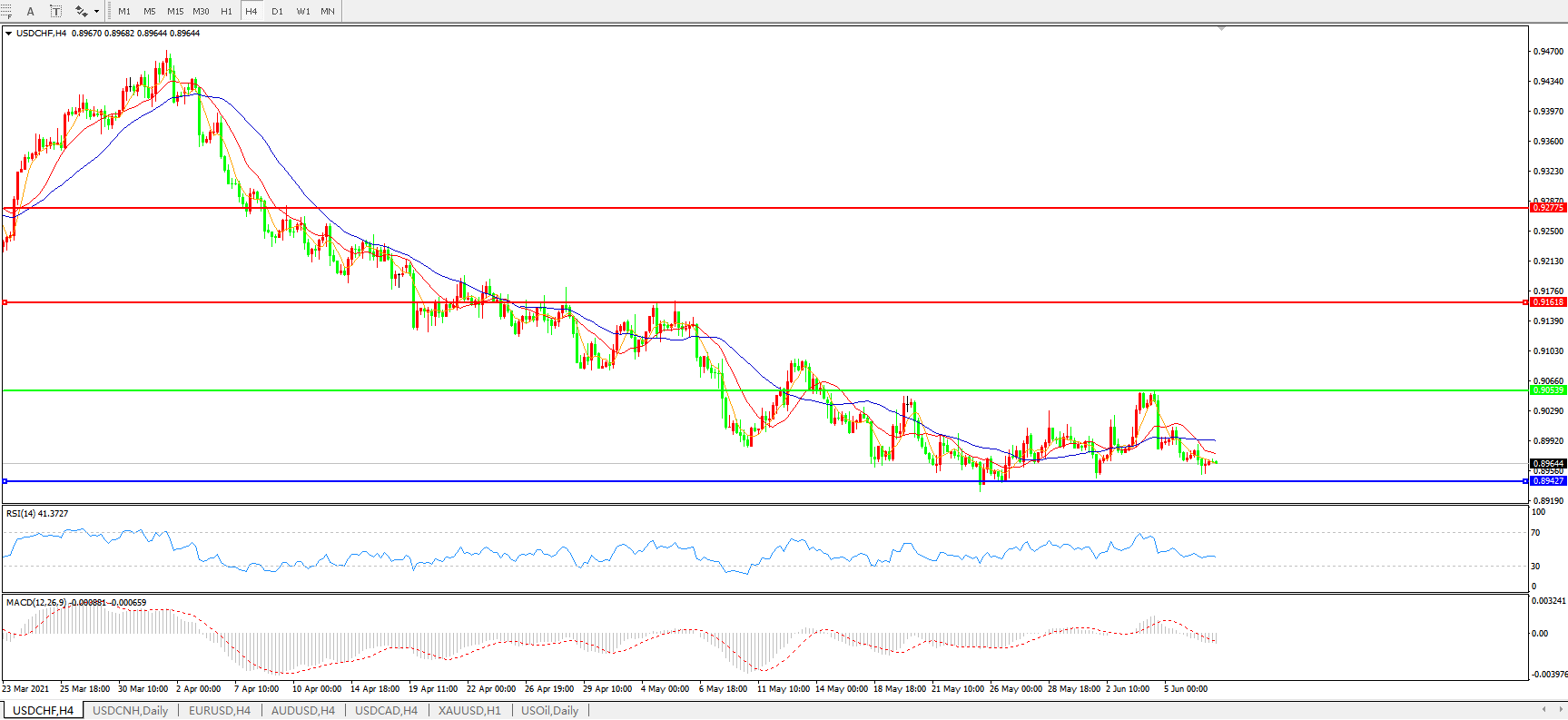 技术面简析:4小时图均线发散下行有止跌迹象,汇价持续下行,MACD运行于0轴下且量能0轴下微放量,RSI偏弱整理,预计短期汇价大概率将进一步下行。
