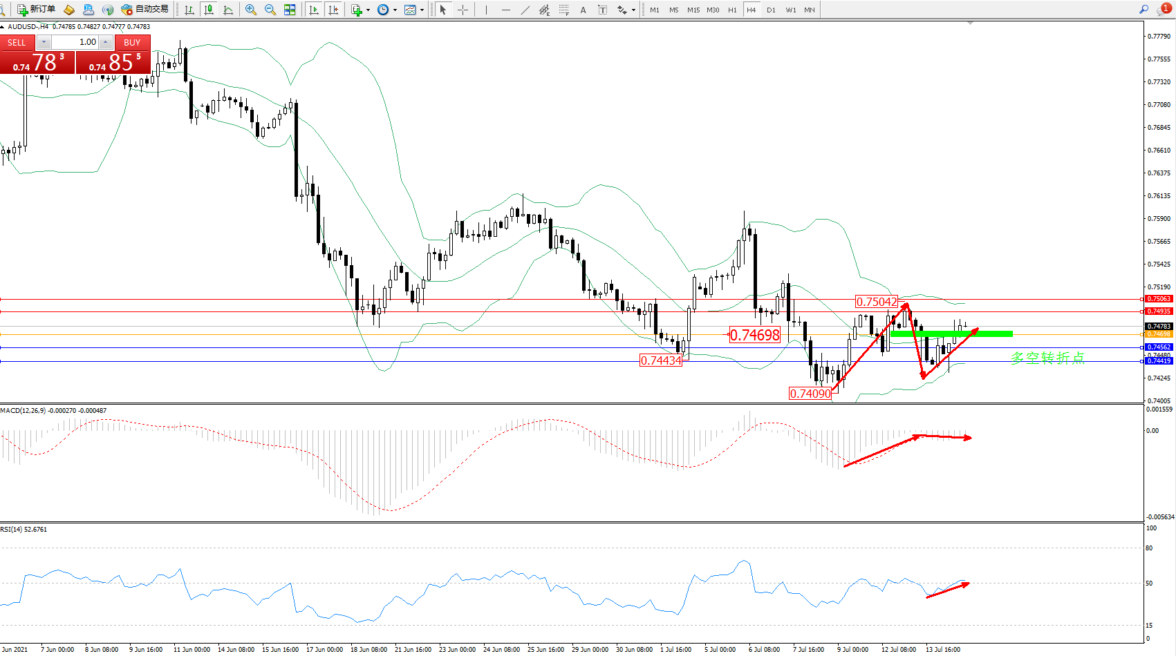 交易策略:0.74698上方看涨,目标0.74935、0.75063