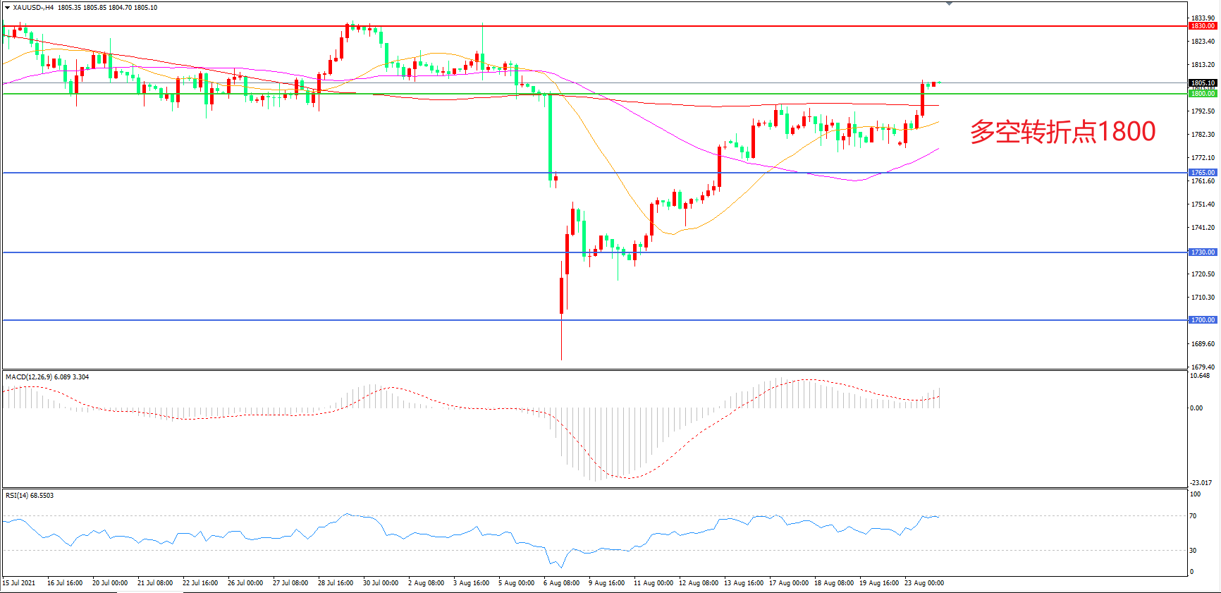 4小时图看,金价长阳拉升,强势突破200周期均线,短期走势偏强,1800成为多空分水岭,MACD红柱增加,RSI指标走平,日内震荡上行较大。