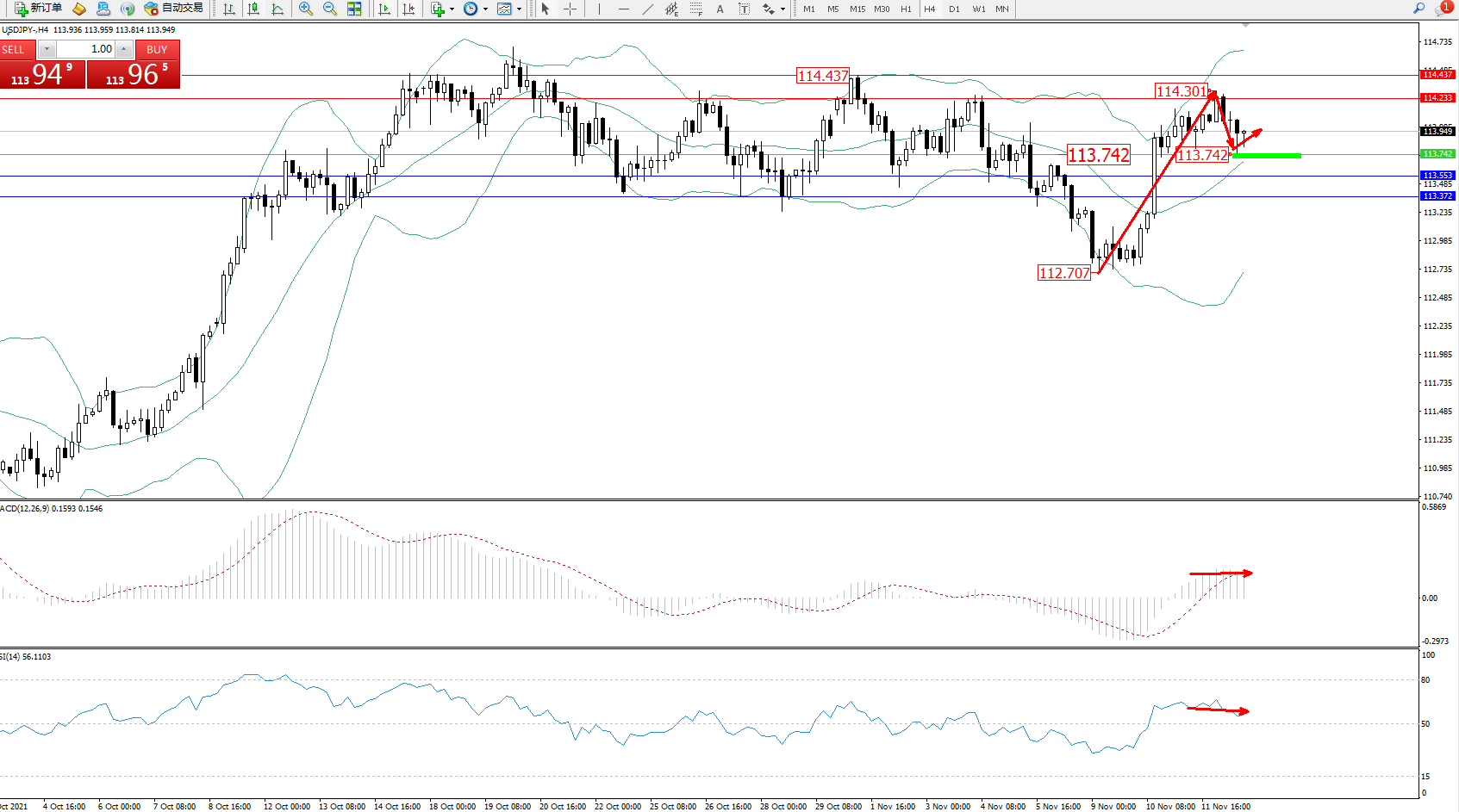 备选策略:113.742下方看跌,目标113.553、113.372