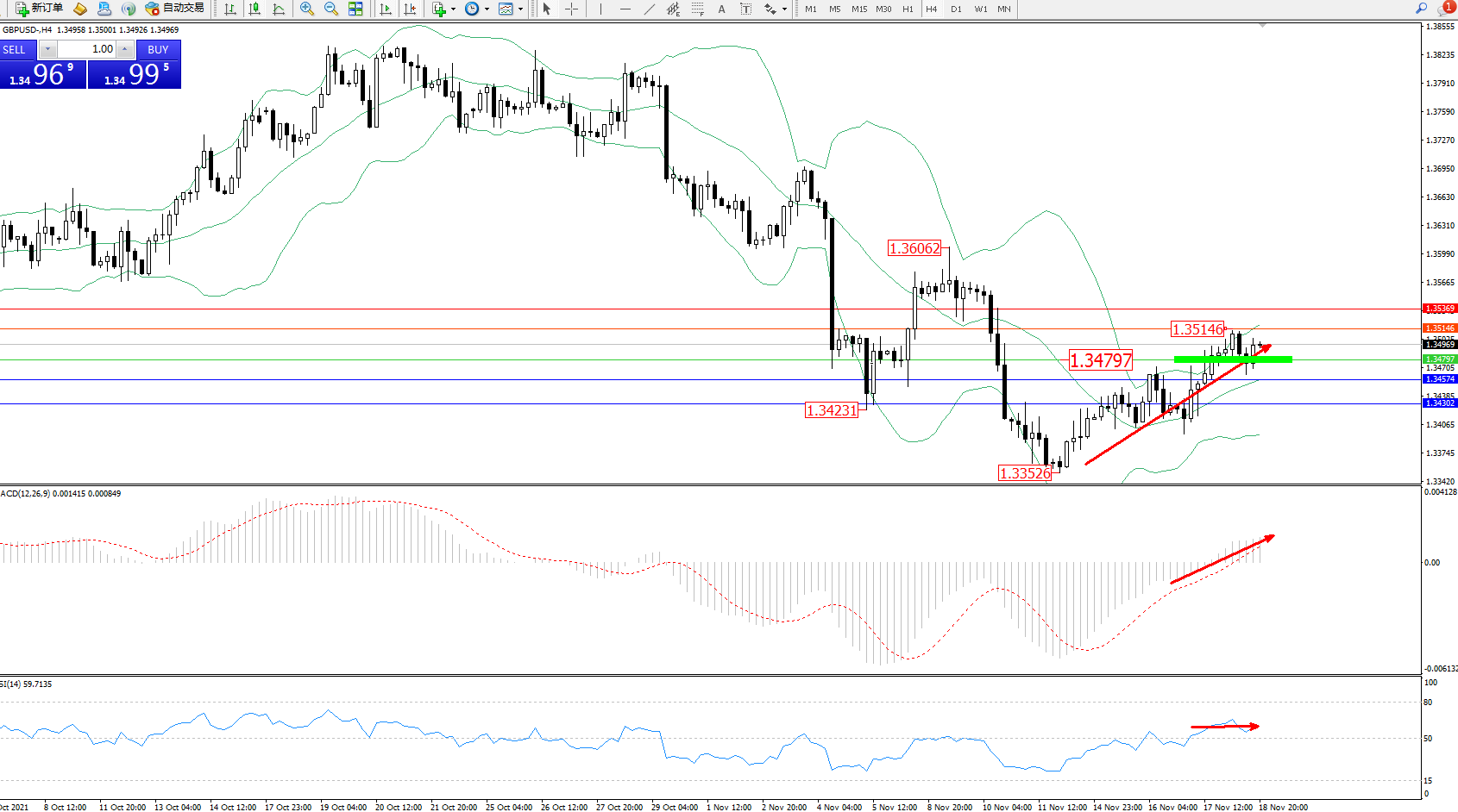 交易策略:1.34797上方看涨,目标1.35146、1.35369