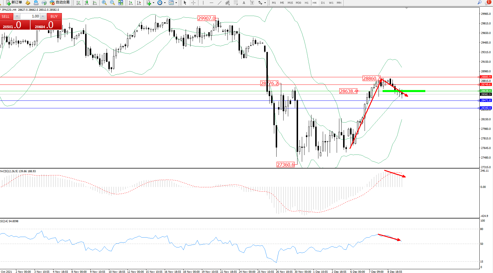 技术点评:多头动力延续布林带指标上轨附近持续震荡上扬,高位抵达28860位置后遇阻回撤,触及布林带指标中轨附近徘徊后有继续下行迹象,布林带指标呈收口走势中,MACD指标处于多头区域维持整理缓慢下行,RSI指标处于多头区域维持整理弱势下行,即将触及50均衡线附近;