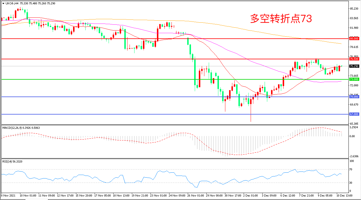 4小时图看,油价延续高位调整,区间震荡继续明显,73美元成为下方支撑,76.5美元成为多空分水岭,MACD红柱缩短,RSI指标走平,日内延续震荡概率较大。