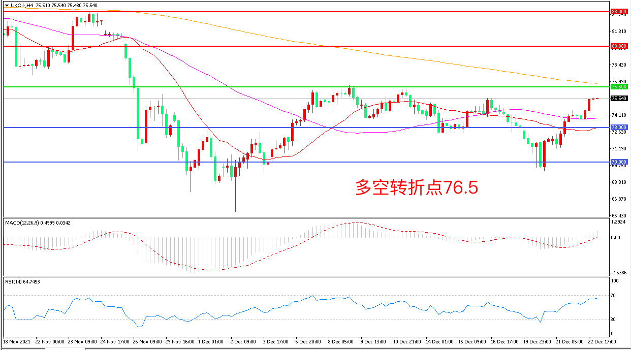 周三(12月22日),在寒冷天气席卷欧洲之际,能源市场又遭受新的供应面利空打击,天然气价格飙升带动能源价格整体反弹,布伦特原油延续强势表现,收报75.54美元/桶。在昨天公布的EIA数据中,原油库存下降470万桶给了多头一定的信心,在欧洲能源危机愈演愈烈时,油价有望迎来爆发。