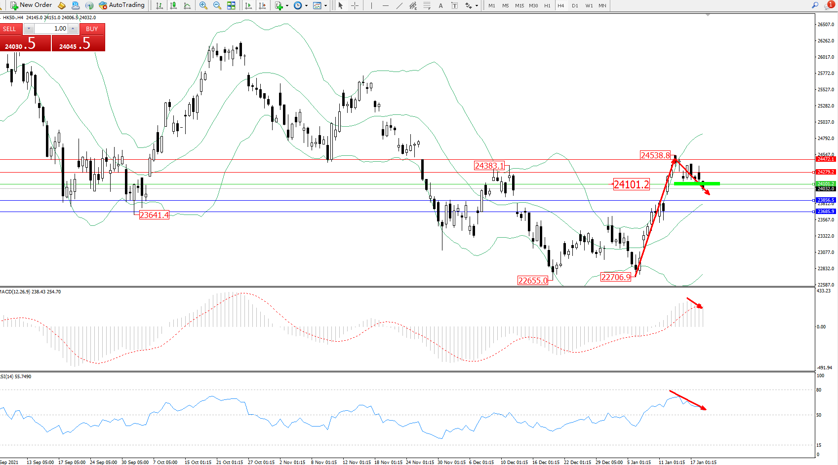 恒指HK50 ——4小时K线图显示: