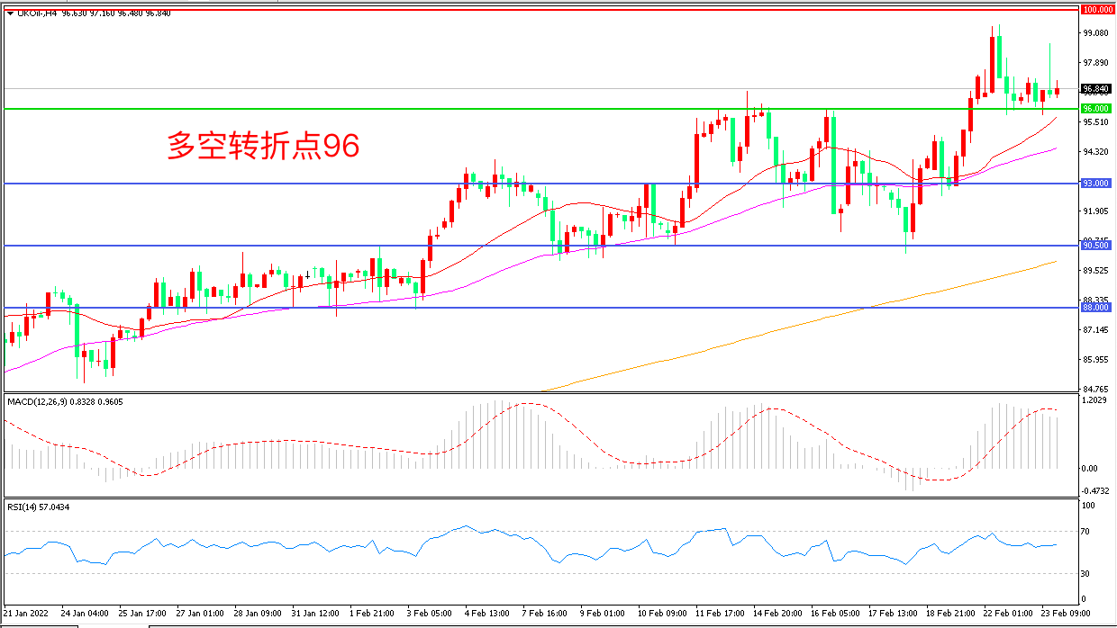4小时图看,油价强势突破96美元一线后再度回落,上行趋势暂缓,但均线系统支撑仍然有效,MACD红柱增加,RSI指标走平,日内震荡上行概率较大。