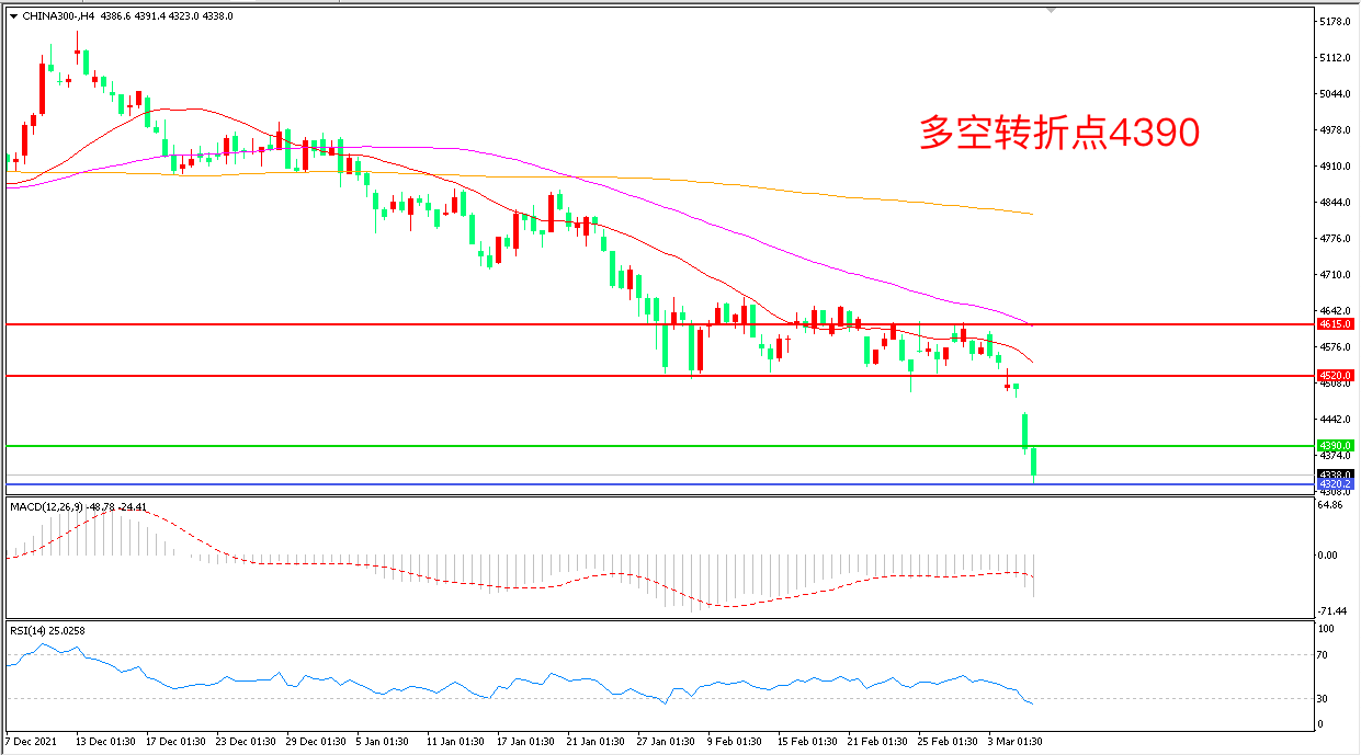 周一(3月7日),两市股指两市股指集体低开,随后进一步跳水,恐慌情绪蔓延到只沪深300长阴下坡,收报4338点。市场成交相对低迷,北上资金大幅净流出82.71亿元。总的来看,A股市场再度陷于恐慌气氛之中,短期看下跌空间打开将继续探底走势,下行概率较大。