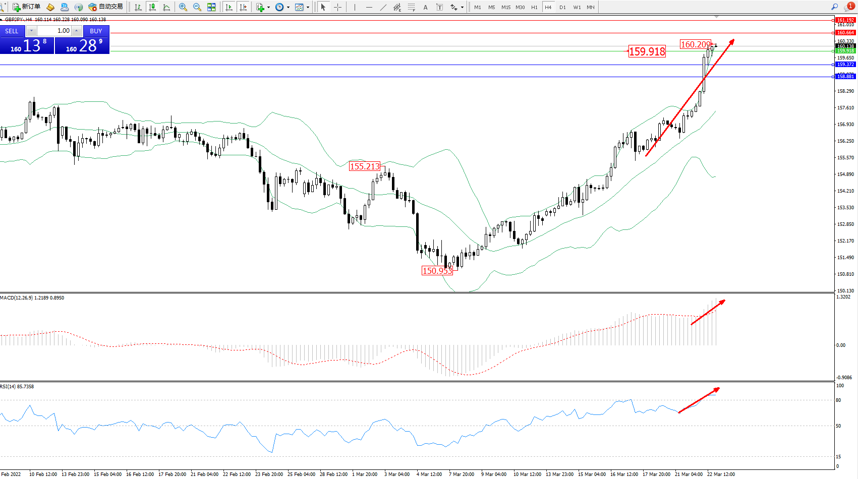 交易策略:159.918上方看涨,目标160.664、161.192