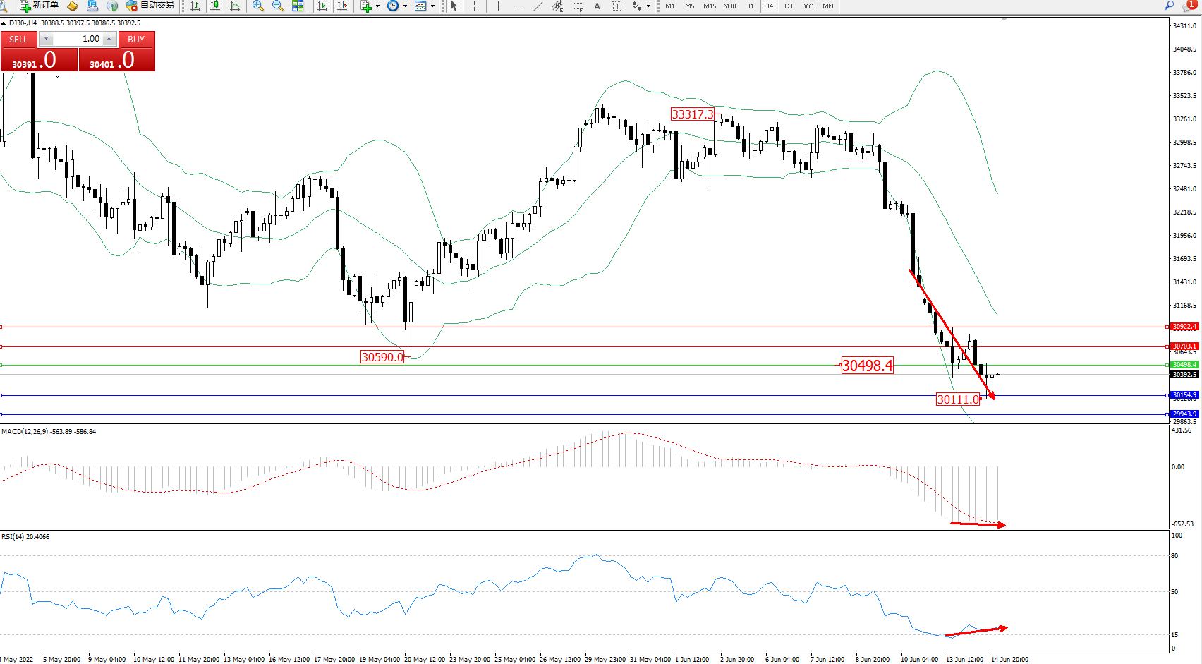 技术点评:空头力度延续布林带指标下轨附近持续下行,低位抵达30111附近节点后整理,布林带指标呈收口走势不断下行,MACD指标处于空头区域低位维持整理平移,RSI指标处于空头区域底部维持弱势徘徊;