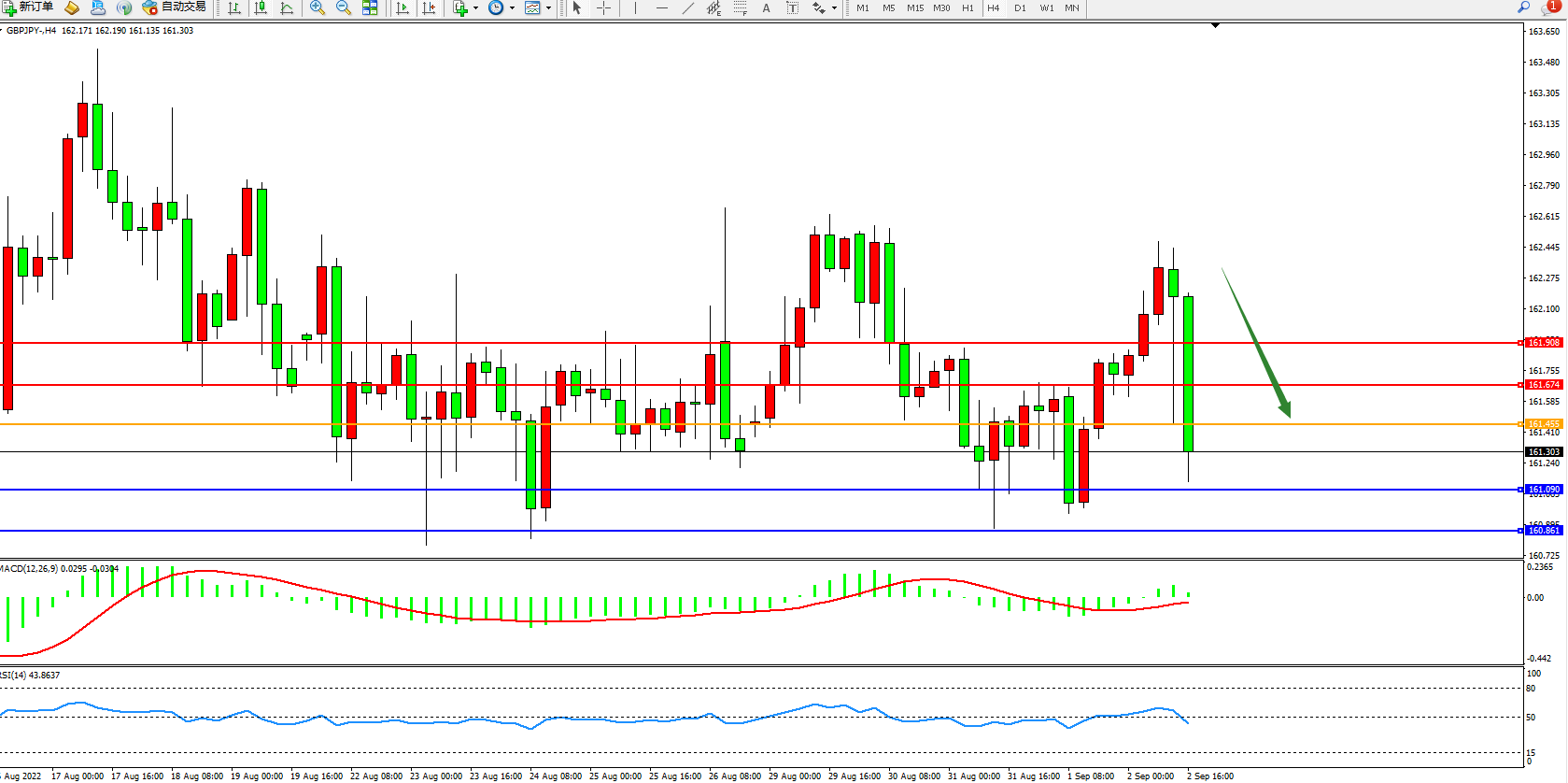 交易策略:161.455下方看跌,目标161.090、160.861