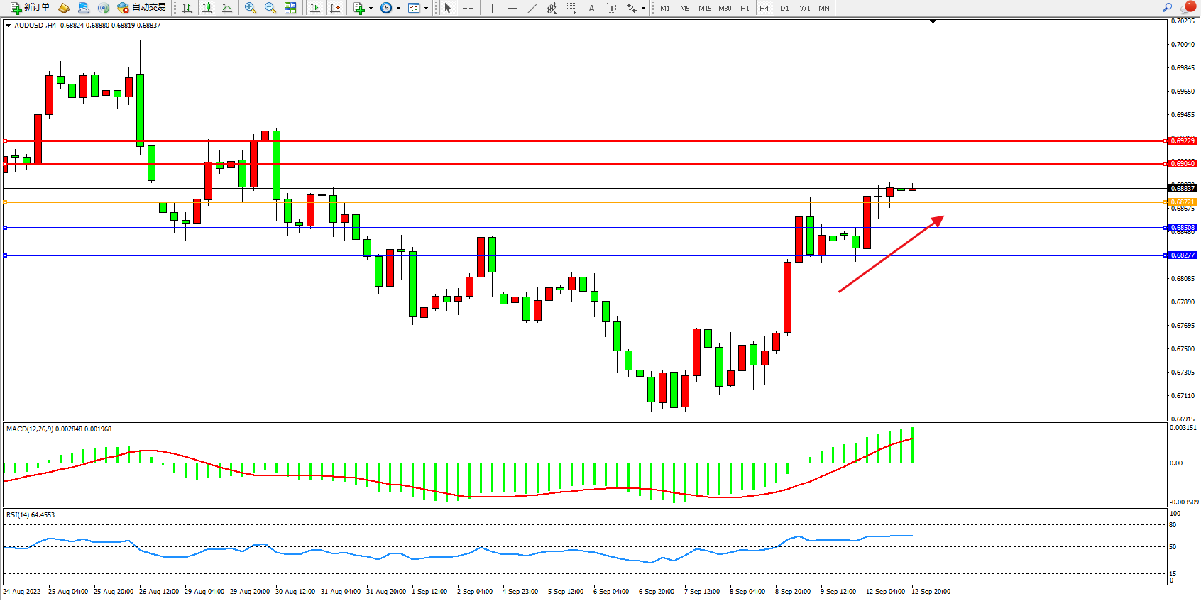 交易策略:0.68721上方看涨,目标0.69040、0.69229
