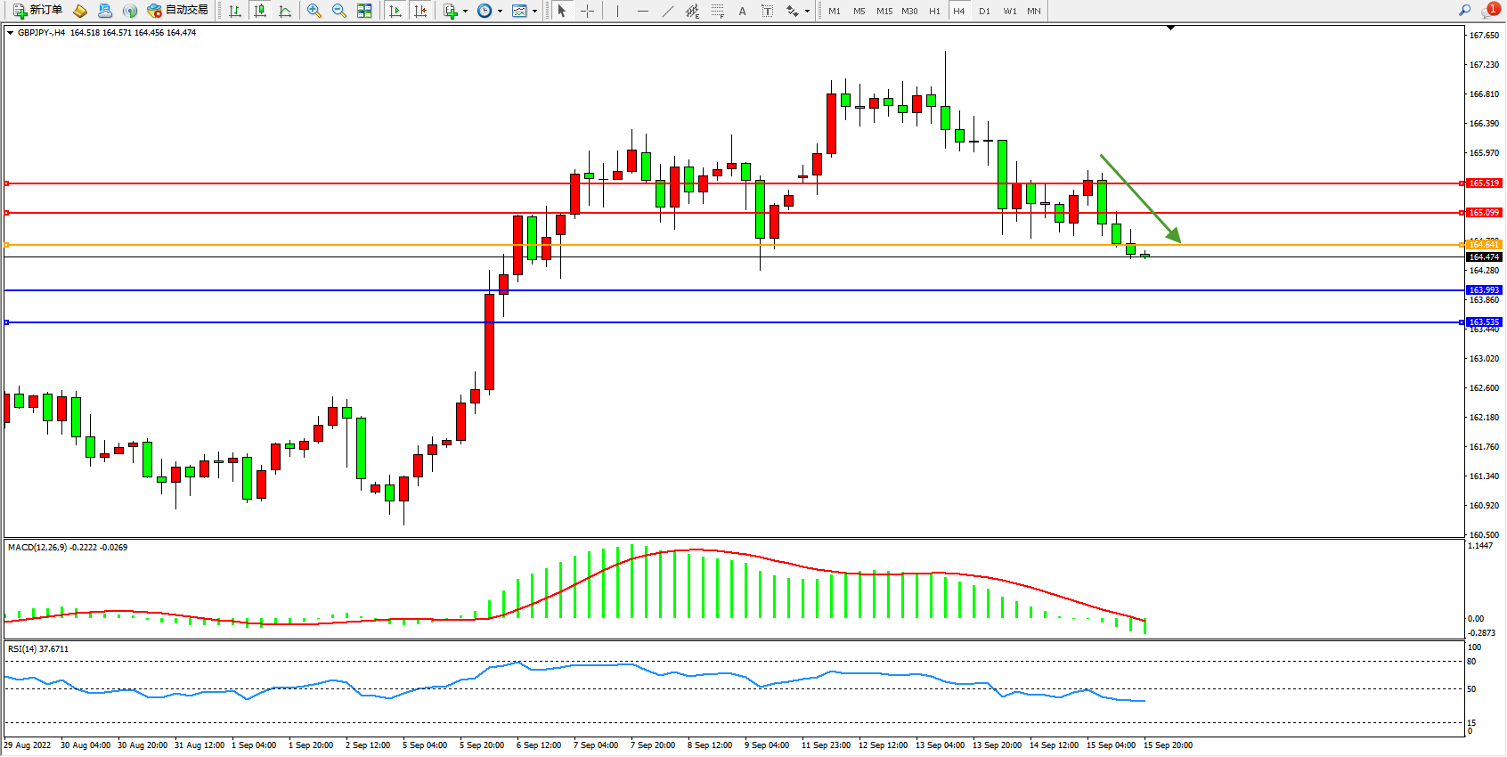 4小时图看:高位短期窄幅整理,市场多头上扬后有继续窄幅震荡走势迹象,MACD指标处于0轴线上側徘徊,RSI指标处于50均衡线上側弱势整理;