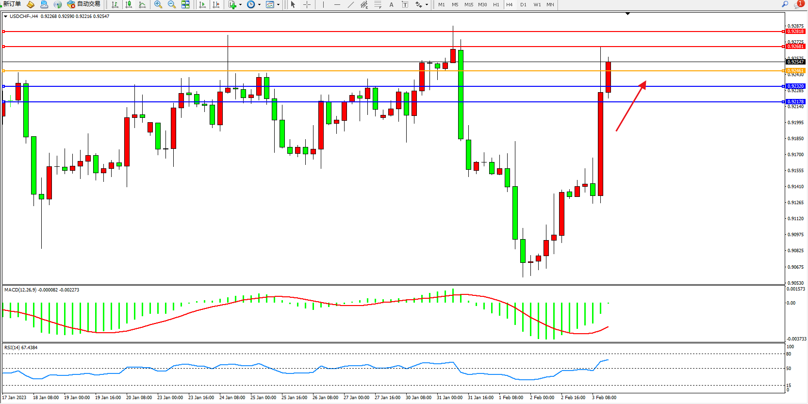 美元瑞郎USDCHF——4小时K线图显示: