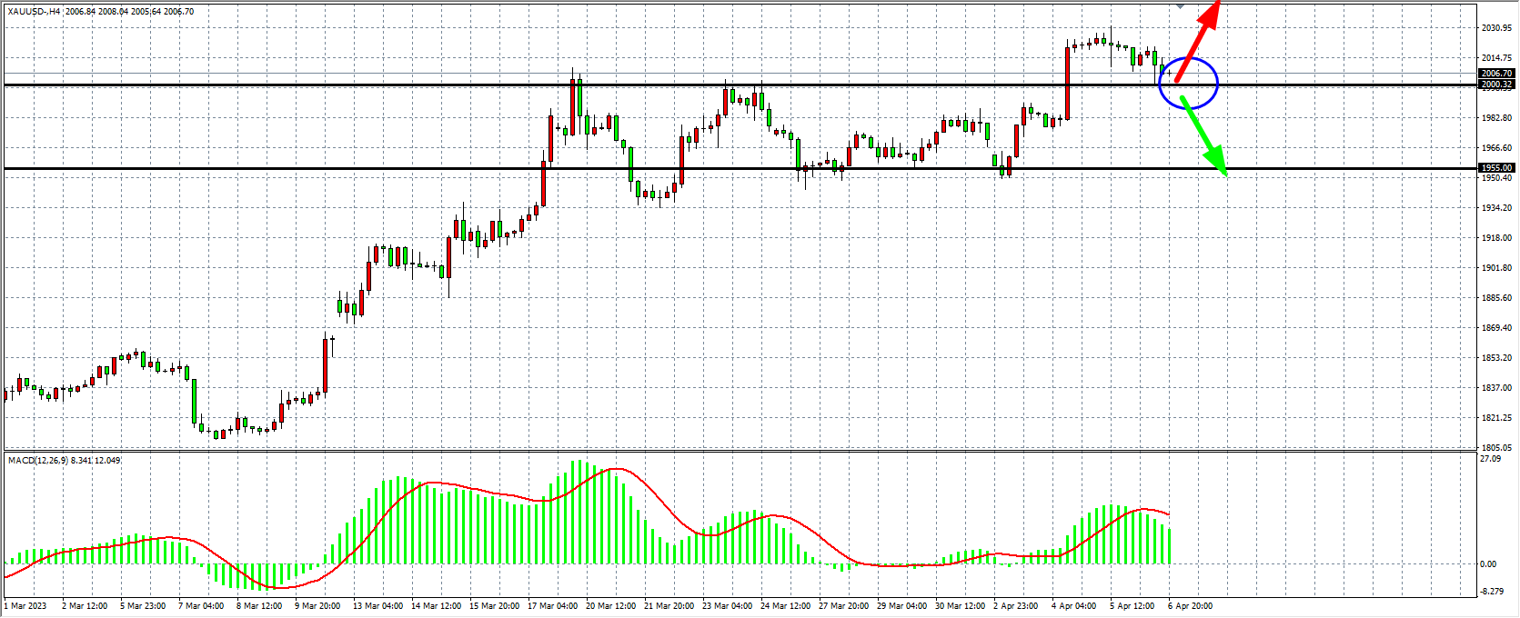 周四(4月6日)美联储资产负债表再次萎缩,银行业危机或将告一段落,美联储鹰王继续高举加息大旗。,货黄金盘中跌落2010美元关口并一度至2000美元,但最终收复部分失地,收跌0.63%。展望后市,最新公布的非农报告接近预期,美联储加息预期迅速飙升,美指及美债收益率走高,金价面临基本面利空、技术看跌的回调风险。