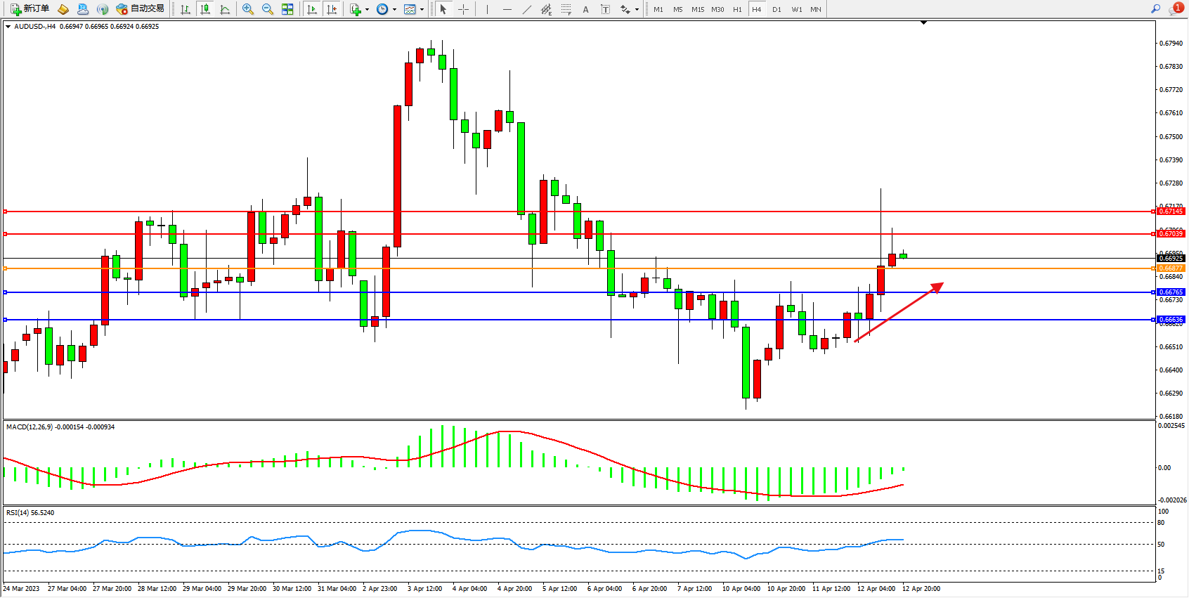 交易策略:0.66877上方看涨,目标0.67039 0.67145