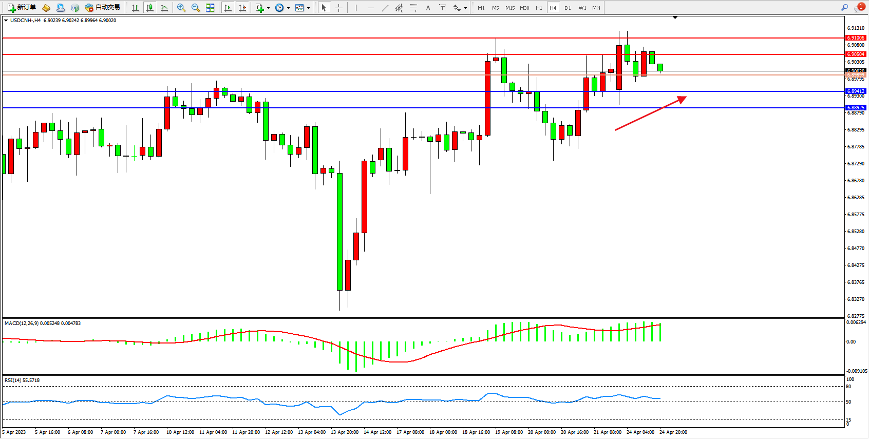 交易策略:6.89899上方看涨,目标6.90504 6.91006