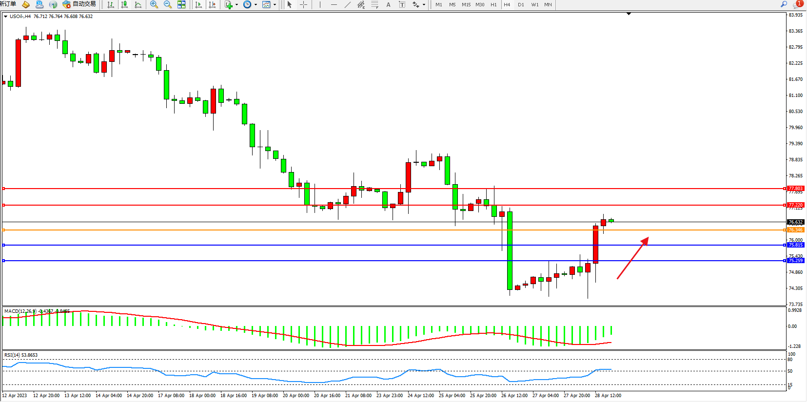 交易策略:76.346上方看涨,目标77.220  77.803