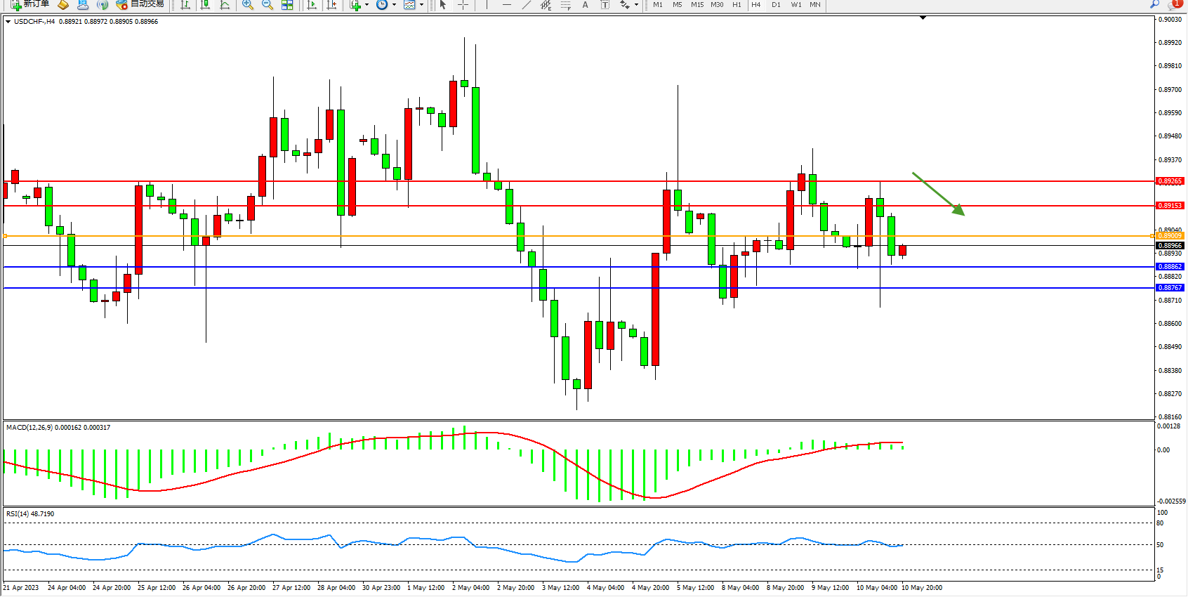 美元瑞郎USDCHF——4小时K线图显示: