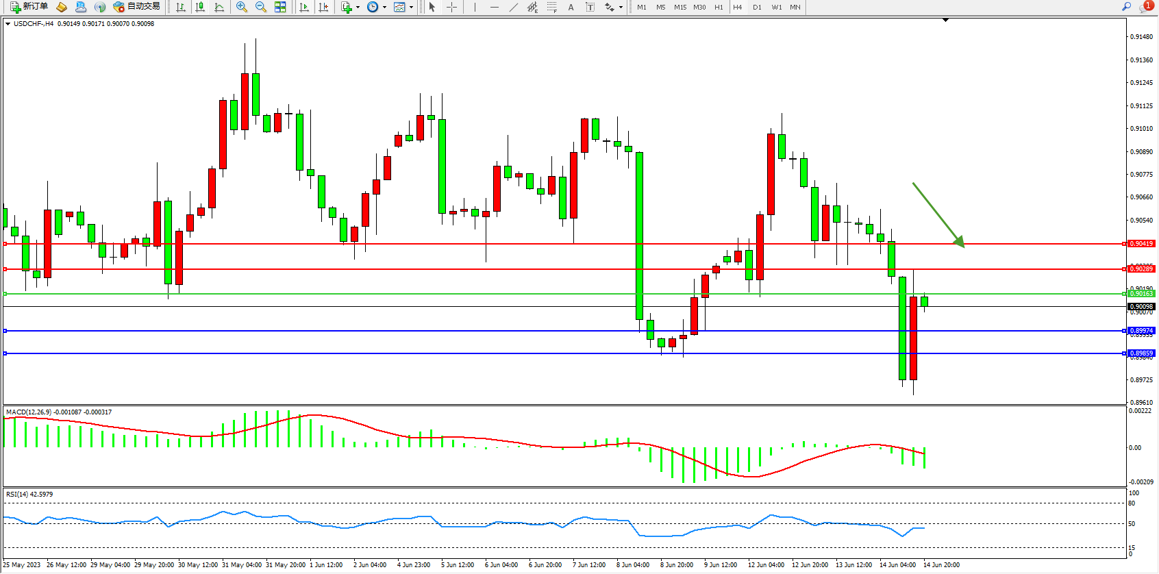 美元瑞郎USDCHF——4小时K线图显示: