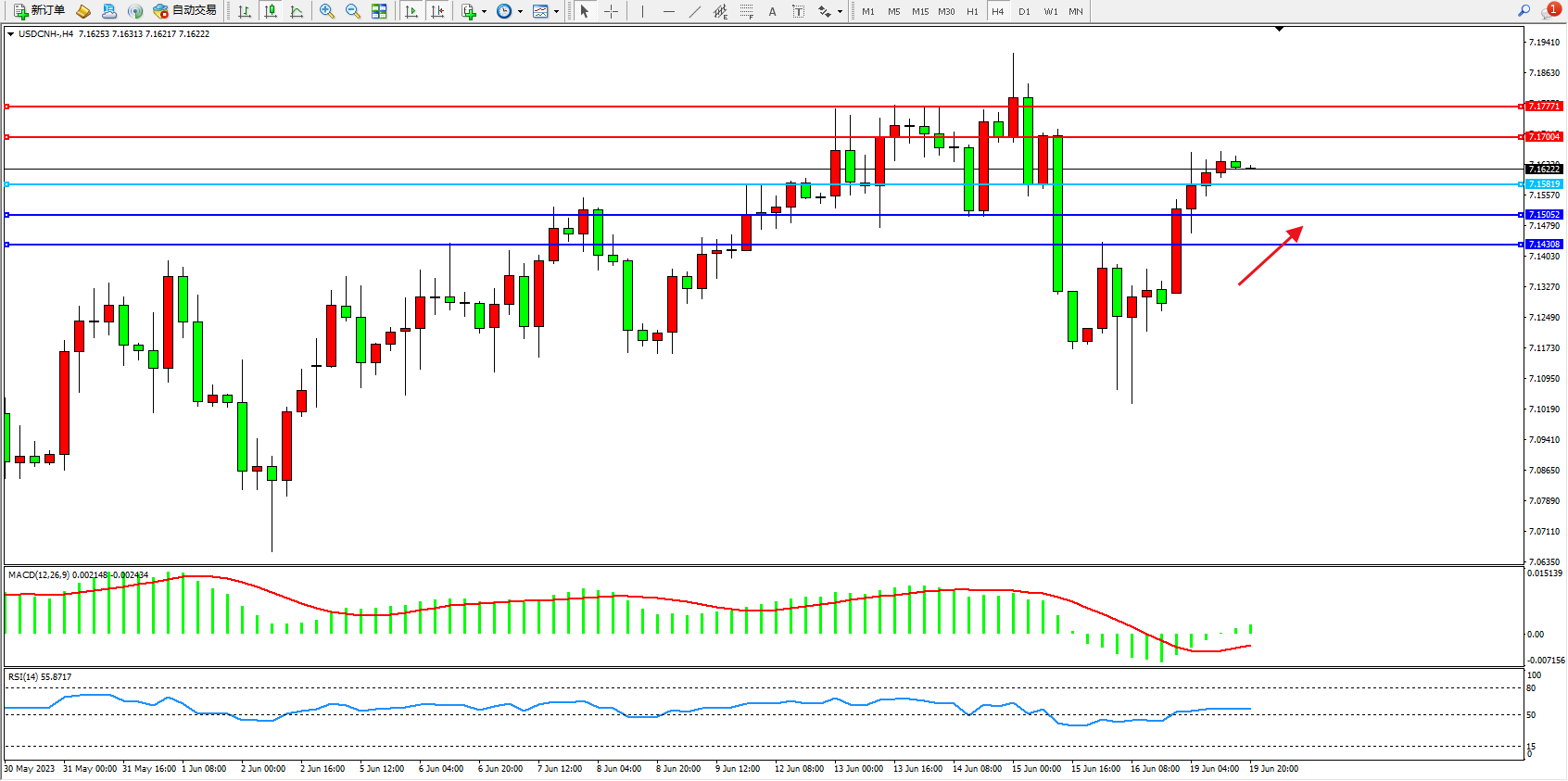 交易策略:7.15819上方看涨,目标7.17004  7.17771