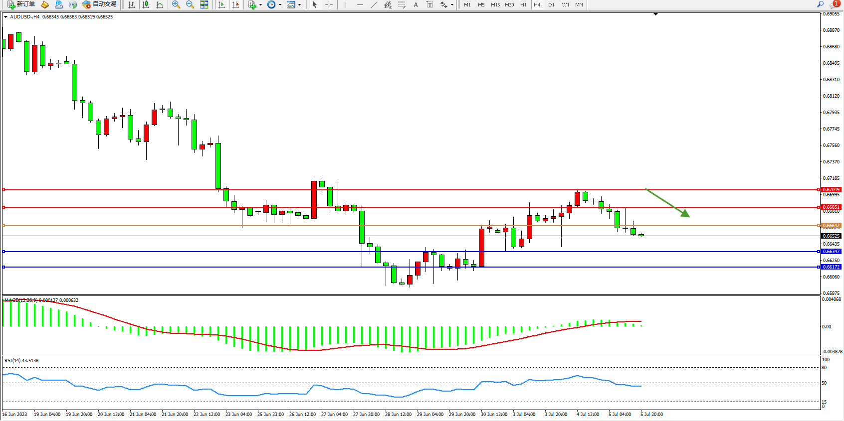 交易策略:0.66642下方看跌,目标0.66347  0.66172