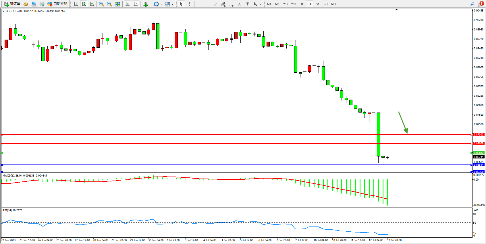 美元瑞郎USDCHF——4小时K线图显示: