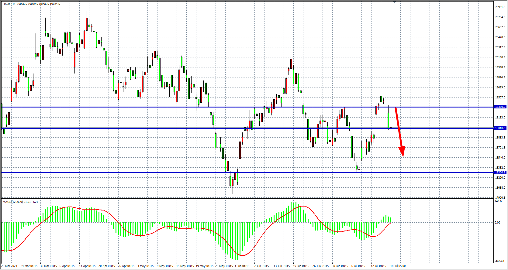 4小时图看,恒指在19350下方走跌,MACD量能在零轴上缩量,多头表现仍旧较强,目前19350转为阻力,该位之下看跌18800-18500。