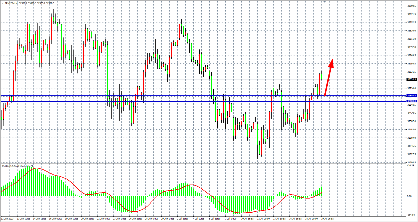 4小时图看,日经指数再度走高至33000附近,MACD量能于零轴之上,趋势回归上涨,阻力关注33300-33500,支撑关注32680、32600。